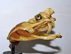 The venom glands that secrete zootoxins are a modification of the parotid salivary glands found in other vertebrates and are usually located on each side of the head, below and behind the eye, and enclosed in a muscular sheath. The venom is stored in large glands called alveoli before being conveyed by a duct to the base of channeled or tubular fangs through which it is ejected.[3][4]