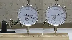 The photograph at right shows such an arrangement using a small combination jointer/planer. The indicator's stand rests on the base plate of the planer frame. The probe touches the underside of the planer table directly below the middle of the cutter head. The leadscrews, which can be clearly seen to the left and right, support the table about one inch (25 mm) below the cutter head. A piece of white cedar about 12 inches long, four inches wide and just over one inch thick was passed through the planer to execute a cut of moderate depth.