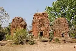 Snoeng East Temple, known locally as Prasat Snoeng Khang Khaeut, is a complex of three distinct tower remains made of bricks on a laterite slab,[1][10] aligned on the north–south axis with all having an entrance facing east.[4][9] The trio share a common terrace, each having an extended entrance with a sandstone doorframe and are situated on top of a hill.[4][5] The center tower is the largest of the three, possessing octagonal, decorated door columns which support its decorative lintel in situ. The temple towers are surrounded by pedestals and elements, especially those of Crown.[4] The dimensions of the eastern block is 30m in length and 20m in width and features a structure similar to other temples from the 12th century.[5][1] A large lintel on the door shows Indra sitting on his three-headed elephant Airavata next to Rahu,[9] with foliage differing those from of the early and late 12th century, making it likely to have been built it during the early 11th century under Suryavarman I who was local ruler then.[b][1] Kim Sophoan, director of the Department of Culture and Fine Arts for Battambang province, claims that the East Temple was built in the 11th century during the reign of King Udayadityavarman II, whose reign lasted from 1050 to 1066.[9]