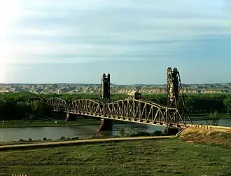 Snowden Bridge is a high-clearance, vertical-lift railroad bridge, built in 1913, that spans the Missouri River between Roosevelt and Richland Counties in Montana, USA, between Bainville and Fairview, Montana, and near Fort Union Trading Post National Historic Site and the ghost town of Mondak near Montana's eastern border with North Dakota. Snowden Bridge is a near twin of the Fairview Bridge, which crosses the Yellowstone River in North Dakota, both bridges having been built by Montana Eastern Railway within 10 miles (16 km) of each other over different rivers in different states.[1]