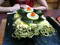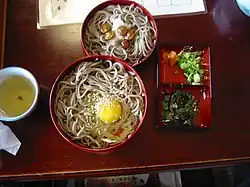 Chilled soba is often served on a sieve-like bamboo tray called a zaru, sometimes garnished with bits of dried nori seaweed, with a dipping sauce known as soba tsuyu on the side.[28] The tsuyu is made of a strong mixture of dashi, sweetened soy sauce (also called "satōjōyu") and mirin. Using chopsticks, the diner picks up a small amount of soba from the tray and dips it in the cold tsuyu before eating it. Wasabi and sliced negi are often mixed into the tsuyu.[29] Many people think that the best way to experience the unique texture of hand-made soba noodles is to eat them cold, since letting them soak in hot broth changes their consistency. After the noodles are eaten, many people enjoy drinking the water in which the noodles were cooked (sobayu 蕎麦湯), mixed with the leftover tsuyu.[30]