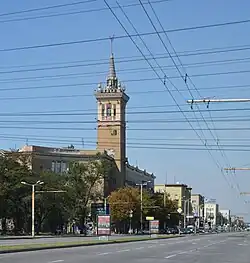 Starting its way from Pryvokzalna Square, the avenue runs through the headquarters of ZAZ and exits after Transportna Square on a straight section (with a slight bend) for a length of approximately 9 km (5.6 mi). The total length of Sobornyi Avenue is 10.8 km (6.7 mi), due to which some sources claim that the avenue is the longest in Europe.[2][3] However, Sobornyi Avenue is surpassed in length by Heroiv Kharkova Avenue in Kharkiv (18 km (11 mi))[4] and Lenin Avenue in Volgograd (14 km (8.7 mi)).[5] The residential quarters of Sotsmisto in the area of the Dnieper Hydroelectric Station dam and Metalurhiv Avenue are considered to be one of the best examples of constructivist architecture of the first half of the 20th century. The project of this architectural ensemble in 1932 received a gold medal at an exhibition in Paris.[6] Sobornyi Avenue claims the title of one of the "7 Wonders of Zaporizhzhia".[7]