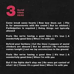 Following a decade of living in Los Angeles, Dallon Weekes felt isolated amidst an energetic life in the city.[3][4] He started writing a song with the theme, finishing it in 2017 as "Social Climb" and performing it live thereafter with drummer Ryan Seaman as I Dont Know How But They Found Me.[5] The song begins with a central synth melody,[6] built around by Weekes' vocals and alternative rock instrumentation. It lyrically advocates for maintaining independence and fighting toxic influences.[2] The track released as part of 1981 Extended Play on November 9. Sophie Walker of DIY compared the song's to Fall Out Boy's work, highlighting "chant-worthy choruses, thunderous drum beats and arena-tailored hooks".[6] Anna Rose of Hysteria Magazine was enticed by its varied sound and debauched lyricism, classing it with music used in the animated sitcom Rick and Morty.[7] Weekes called it his favorite track of the EP, particularly for the equipment used on it by co-producer Jason Hill.[8]