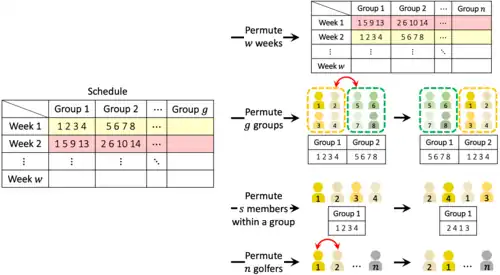 - ^ Harvey, Warwick. "Problem 010: Social Golfers Problem". www.csplib.org. Retrieved 6 September 2021.