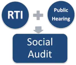 A grass roots organisation of Rajasthan, Mazdoor Kisan Shakti Sangathan (MKSS) is believed to have used the concept of the social audit while fighting corruption in the public works in the early 1990s. As the corruption is attributed to the secrecy in governance, the 'Jansunwai' or public hearing and the right to information (RTI), enacted in 2005, are used to fight this secrecy.[7] Official records obtained using RTI are read out at the public hearing to identify and rectify irregularities. "This process of reviewing official records and determining whether state reported expenditures reflect the actual monies spent on the ground is referred to as a social audit."[8] Participation of informed citizens promotes collective responsibility and awareness about entitlements.[9]