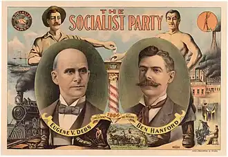 From 1901 to the onset of World War I, the Socialist Party had numerous elected officials throughout the United States. The Mapping Social Movements Project has identified more than 1,000 elected Party members in 353 cities and towns. [8] There were two Socialist members of Congress, Meyer London of New York City and Victor Berger of Milwaukee (a part of the sewer socialism movement, a major front in socialism, Milwaukee being the first and the only major city to elect a socialist mayor, which it did four times between 1910 and 1956); over 70 mayors; and many state legislators and city councilors. The party was able to successfully run candidates in smaller municipalities as well as big cities, winning the mayoralty of Butte, Montana, with Lewis Duncan and that of Schenectady, New York, with George R. Lunn.[9] Its voting strength was greatest among recent Jewish, Finnish and German immigrants, coal miners and former populist farmers in the Midwest.[10] According to Jimmy Weinstein, its electoral base was strongest west of the Mississippi River, "in the states where mining, lumbering, and tenant farming prevailed". It was also able to attract support from railroad workers. Its vote shares were highest in Oklahoma, Nevada, Montana, Washington, California, Idaho, Florida, Arizona and Wisconsin, and it also attracted support in Texas, Arkansas and Kansas.[9] From 1900 (before its formal union) to 1912, it ran Eugene V. Debs for president at each election. The best showing ever for a socialist ticket was in 1912, when Debs gained 901,551 total votes, 6% of the popular vote. In 1920, Debs ran again, this time while imprisoned for opposing World War I, and received 913,693 votes, 3.4% of the total.