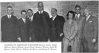 (L-R): Jasper McLevy, Morris Hillquit, James Oneal, Norman Thomas, James H. Maurer, Lilith Martin Wilson, William H. Henry, George E. Roewer.