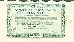 Giovanni Bastista and Matteo Ceirano left F.I.A.T. in 1901 to found Fratelli Ceirano & C. In 1903, Matteo left to found ITALA. In 1904 Giovanni Batista Ceirano transformed Fratelli Ceirano & C. into Società Torinese Automobili Rapid, using the name Rapid as a trademark. Production moved to a 50,000 square meters plant in Barriera di Nizza, Turin, where 500 people worked. The initial share capital was 2,000,000 lire, which in 1905 amounted to 5,000,000. Annual production was 600 units per year.[2]