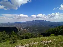 A mining rush followed the Apache wars – gold, silver, and copper were found in the mountains. It wasn't until this time that extensive use of the area by non-Native Americans occurred.[8] While some mining activity, involving gold, silver, and copper, occurred in the southern part of the range near the end of the nineteenth century,[9] the prospecting/mining remnants are barely visible today due to collapse, topographic screening, and vegetation regrowth. While miners combed the mountains for mineral riches during the late nineteenth and early twentieth centuries, stockmen drove tens of thousands of sheep and cattle to stockyards at the village of Magdalena, then linked by rail with Socorro.[6] In fact, the last regularly used cattle trail in the United States stretched 125 miles westward from Magdalena. The route was formally known as the Magdalena Livestock Driveway, but more popularly known to cowboys and cattlemen as the Beefsteak Trail. The trail began use in 1865 and its peak was in 1919. The trail was used continually until trailing gave way to trucking and the trail officially closed in 1971.[5]