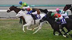 Sodashi made her first start of 2021 in the first leg of the Japanese Fillies Triple Crown, the Japanese 1000 Guineas, where she won by a neck over Satono Reinas. She developed from being "that white filly" to genuine stardom.[16] She suffered her first defeat when she finished eight out of eighteen runners in the 2021 Japanese Oaks, the second leg of the fillies' Triple Crown. She would then go on to win the Sapporo Kinen over open company[17] before closing out her season with a tenth-place finish in the Shūka Sho (in which the horse broke her tooth and was bleeding) and a twelfth-place finish in the Champions Cup.[18][19]