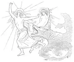A depiction of Sól, her daughter, and the wolf Fenrir (1895) by Lorenz Frølich.