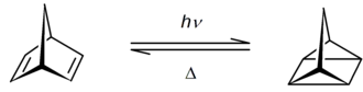 Various ketones, azepines and norbornadienes among other compounds, such as azobenzene and its derivatives, have been investigated as potential energy storing isomers.[4] The norbornadiene-quadricyclane couple and its derivatives have been extensively investigated for solar energy storage processes. Norbornadiene is converted to quadricyclane using energy extracted from sunlight, and the controlled release of the strain energy stored in quadricyclane (about 110 kJ/mole) as it relaxes back to norbornadiene allows the energy to be extracted again for use later.