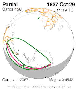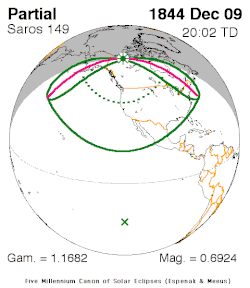During the 19th century, there were 242 solar eclipses of which 87 were partial, 77 were annular, 63 were total and 15 were hybrids between total and annular eclipses. [1][2] In the 19th century, the greatest number of eclipses in one year is five, in 1805, though the years 1801, 1812, 1819, 1823, 1830, 1841, 1848, 1859, 1870, and 1880 had four eclipses each. Two months, January 1805 and December 1880, featured two solar eclipses, on January 1 and January 30 in 1805 and on December 2 and December 31 in 1880. The predictions given here are by Fred Espenak of NASA's Goddard Space Flight Center.[1]