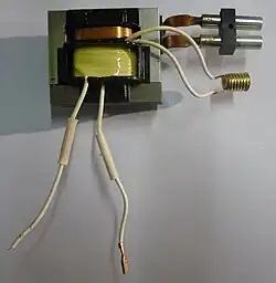 A soldering gun is an approximately pistol-shaped, electrically powered tool for soldering metals using tin-based solder to achieve a strong mechanical bond with good electrical contact. The tool has a trigger-style switch so it can be easily operated with one hand. The body of the tool contains a transformer with a primary winding connected to mains electricity when the trigger is pressed, and a single-turn secondary winding of thick copper with very low resistance. A soldering tip, made of a loop of thinner copper wire, is secured to the end of the transformer secondary by screws, completing the secondary circuit. When the primary of the transformer is energized, several hundred amperes of current flow through the secondary and very rapidly heat the copper tip. Since the tip has a much higher resistance than the rest of the tubular copper winding, the tip gets very hot while the remainder of the secondary warms at a much slower rate. An additional secondary winding is often used to power a pilot lamp which illuminates the workpiece.