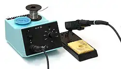 A soldering station has a temperature control and consists of an electrical power supply, control circuitry with provision for user adjustment of temperature and display, and a soldering iron or soldering head with a tip temperature sensor. The station will normally have a stand for the hot iron when not in use, and a wet sponge for cleaning. It is most commonly used for soldering electronic components. Other functions may be combined; for example a rework station, mainly for surface-mount components may have a hot air gun, vacuum pickup tool, and a soldering head; a desoldering station will have a desoldering head with vacuum pump for desoldering through-hole components, and a soldering iron head.