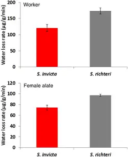 The ant faces many respiratory challenges due to its highly variable environment, which can cause increased desiccation, hypoxia, and hypercapnia. Hot, humid climates cause an increase in heart rate and respiration which increases energy and water loss.[59][71] Hypoxia and hypercapnia can result from red imported fire ant colonies living in poorly ventilated thermoregulatory mounds and underground nests. Discontinuous gas exchange (DGE) may allow ants to survive the hypercapnic and hypoxic conditions frequently found in their burrows;[58] it is ideal for adapting to these conditions because it allows the ants to increase the period of O2 intake and CO2 expulsion independently through spiracle manipulation. The invasion success of the red imported fire ant may possibly be related to its physiological tolerance to abiotic stress, being more heat tolerant and more adaptable to desiccation stress than S. richteri. This means that the ant is less vulnerable to heat and desiccation stress. Although S. richteri has higher water body content than the red imported fire ant, S. richteri was more vulnerable to desiccation stress. The lower sensitivity to desiccation is due to a lower water loss rate.[72] Colonies living in unshaded and warmer sites tend to have a higher heat tolerance than those living in shaded and cooler sites.[73]