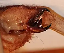 Among the most distinctive features of the Solifugae are their large chelicerae, which in many species are longer than the rest of the prosoma. Each of the two chelicerae has two articles (segments; parts connected by a joint),[17] forming a powerful pincer, much like that of a crab; each article bears a variable number of teeth, largely depending on the species.[7][9] The chelicerae of many species are surprisingly strong; they are capable of shearing hair or feathers from vertebrate prey or carrion, and of cutting through skin and thin bones such as those of small birds.[16] Many Solifugae stridulate with their chelicerae, producing a rattling noise.[4]