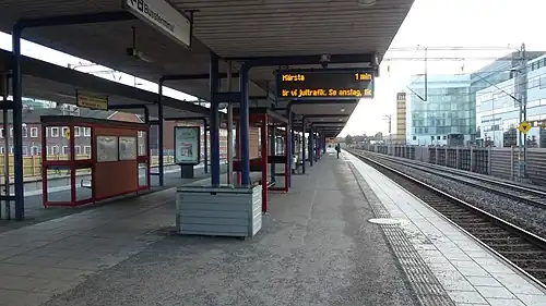 Sollentuna is one of the five stations of the Stockholm commuter rail in Sollentuna Municipality. It is situated in the neighbourhood of Tureberg 13.3 km north of Stockholm Central Station. The station was originally called Tureberg and was opened in 1866 in a rural setting along the railway StockholmUppsala. The name was changed to Sollentuna in 1968 at the request of the municipality,[2] since Tureberg is the de facto centre of the municipality. The area around the station has developed into a suburban centre with high rise buildings, a bus terminal and a large shopping mall.