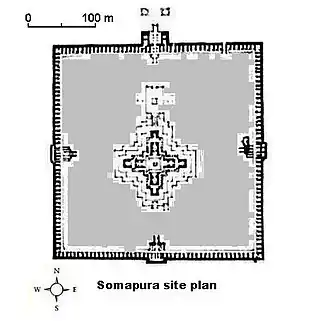 In acreage, Somapura was the largest of the mahaviharas.[11] According to Sukumar Dutt, the complex was dominated by a temple, which was strongly reminiscent of Hindu-Buddhist temples of Burma, Java and Cambodia, reproducing the cruciform basement, terraced structure with inset chambers and gradually dwindling pyramid form .... during the age of the Palas some sort of intercourse between eastern India and south-east Asia existed."[12] Another commented, "there can be no doubt that this style of architecture has most profoundly influenced that of Burma, Java and Cambodia. The nearest approximation to the plan and the superstructure of the Paharpur temple is afforded by the temples known as Chandi Loro Jongrang and Chandi Sevu of Prambanam in Central Java."[12]