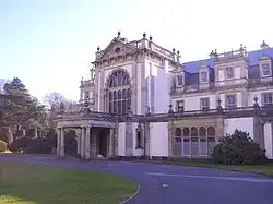 The main location shoot for the episode was at Margam Country Park in Margam, Port Talbot in and around a converted Orangery which provided a location for the wedding and reception.[1] Way states that one of the reasons Margam's Orangery was chosen for the shoot was because of the "fantastic windows" which provided a good visual opportunity in regards to a sequence involving the alien Carrie jumping out of them. However, due to its listed building status the production crew were not able to remove the window glass for filming and had to construct replica windows on separate scaffolding using resin glass.[3] The hotel exteriors and sequences set in the gardens of the wedding venue were filmed at Dyffryn Gardens in St Nicholas, Vale of Glamorgan. The hotel interiors were partly recorded at Court Colman Manor in the village of Pen-y-fai, Bridgend, and partly in studio. The opening sequence of the episode where Gwen pursues the shape-shifter was recorded on 19 November in a men's public toilet in The Hayes, a shopping area in central Cardiff.[1]