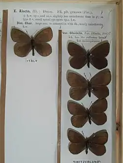 E. glacialis Esp. (= alecto Frr.) (37 b). Upperside of both wings sombre black-brown, with an obsolescent red-brown band on the forewing which often hardly contrasts with the ground-colour. The hindwing is either simply blackish brown, or there is a faint red-brown tint in the place of the distal band. The forewing is beneath dark russet in the centre, being a little lighter in the female; the hindwing uniformly dark black-brown in the male, and blackish grey in the female, a little lighter distally. — Distributed over the whole Alps, but occurring above the tree line, in July and August, on localities covered with boulders. — In alecto Hbn. (= persephone Esp., nicholli Oberth.) (37b) both sexes have before the apex of the forewing two white-centred ocelli, which are also visible beneath. On the hindwing, too, there are 2-4 whitecentred ocelli, which are generally but partly present beneath or may be entirely absent. Otherwise like the form glacialis. More an insect of the northern and eastern Limestone Alps, occurring but sporadically and mostly in small numbers of individuals. — pluto Esp. (= tisiphone Esp., duponcheli Oberth.) (37 c) has the upper- and underside uniformly black, only in the female there being occasionally a faint reddish brown tint on the upperside of the forewing. From the Abruzzi and the highest Alps.[2]