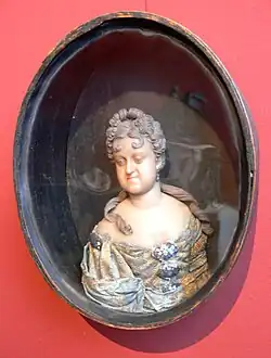 Frederick and Sophia Charlotte became king and queen of Prussia in 1701. The Queen was the daughter of Sophia, Dowager Electress of Hanover, and the sister of George, Elector of Hanover. She was renowned for her intelligence and strong character, and her uncensored and liberal court attracted a great many scholars, including philosopher Gottfried Leibniz.[1] Sophia Charlotte took in Caroline of Ansbach, the daughter of her friend Princess Eleonore Erdmuthe of Saxe-Eisenach. In Sophia Charlotte's sphere, Caroline was exposed to a lively and liberal intellectual environment quite different from anything she had experienced previously. Before she began her education under Sophia Charlotte's care, Caroline had received little formal education; her handwriting remained poor throughout her life.[2] With her lively mind, Caroline developed into a scholar of considerable ability.[1] She and Sophia Charlotte developed a strong relationship in which Caroline was treated as a surrogate daughter;[3] the Queen once declared Berlin was "a desert" without Caroline whenever she left temporarily for Ansbach.[2] An intelligent and attractive woman, Caroline was much sought-after as a bride. Dowager Electress Sophia called her "the most agreeable Princess in Germany".[4] She was considered for the hand of Archduke Charles of Austria, who was a candidate for the throne of Spain and later became Holy Roman Emperor. Charles made official overtures to her in 1703, and the match was encouraged by King Frederick of Prussia. After some consideration, Caroline refused in 1704, as she would not convert from Lutheranism to Catholicism.[5] Early in the following year, Queen Sophia Charlotte died on a visit to her native Hanover.[6] Caroline was devastated, writing to Leibniz, "The calamity has overwhelmed me with grief and sickness, and it is only the hope that I may soon follow her that consoles me."[6] Sophia Charlotte forever changed Caroline's life, and her liberal views continued to influence Caroline all her life.