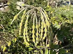 Necklacepod is a nectar plant for bees, butterflies, and in parts of the Americas hummingbirds as well. It is suggested for use by native plant enthusiasts in Florida as a good landscape plant for xeriscaping[5] but it only naturally occurs in coastal counties in the central and southern part of the state,[4] while closely related varieties occur in Texas, and the Caribbean.[6] The variety of Necklacepod growing in Australia is considered an endangered species in some areas due to the clearing of coastal habitat and displacement by invasive species.[7]