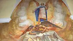 The Carmelite nuns moved to the monastery in 1892 and were there until 1950. They made a numerous reconstructions and modernizations, part of the work was to supply the church with new paintings, which fell to painter Zoltán Básti. He painted various biblical scenes and figures, which included Saint Peter's Basilica, the Esztergom Basilica, and Bishop Vilmos Apor who died in 1945 during the Siege of Győr. Bishop Vilmos Apor refused to release the women who fled to his residence, a Soviet soldier fatally wounded him during a scuffle. The 17-year-old bishop's nephew jumped in front of his uncle and received three bullets, the bishop was also hit by three bullets. Painting Apor was in itself a testament to considerable courage in the beginning of the Stalinist Rákosi era, which built up total terror. However, the painter was not satisfied with that: above the gallery, the triumph of Saint Michael the Archangel over Satan is depicted, but his defeated face was inspired by the Soviet dictator Joseph Stalin.[12][13][14]