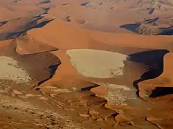 Sossusvlei (sometimes written Sossus Vlei) is a salt and clay pan[1] surrounded by high red dunes, located in the southern part of the Namib Desert, in the Namib-Naukluft National Park of Namibia. The name "Sossusvlei" is often used in an extended meaning to refer to the surrounding area (including other neighbouring vleis such as Deadvlei and other high dunes). These landmarks are some of the major visitor attractions of Namibia.[2]