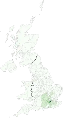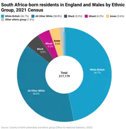 Unlike the country of South Africa itself, the majority of the South African diaspora living in the United Kingdom are White South Africans. Of all people identifying as South African in England and Wales, 86% identify as white, while 12% identify as black and 2% as mixed.[12] According to the 2021 Census, the majority of South African born people in the UK live in Surrey and South West London, particularly in Putney, Wimbledon, Elmbridge, Woking, and Merton.[13]