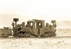 Zwillinge locomotives, the first engines to enter service on the Nordbahn, were a class of small 600 millimetres (23.6 inches) narrow gauge paired 0-6-0T steam locomotives. They were built in Germany in the late nineteenth and early twentieth century for military railways in Germany and the German Empire. The first large consignment of Zwillinge locomotives arrived in Swakopmund between 1898 and 1899. Eventually, by 1905, more than fifty new or used pairs had been delivered to the Swakopmund-Windhuk Staatsbahn.[1][2]