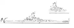 On 26 July 1954, a conversion proposal for the South Dakota–class ships was ordered by the Chairman of the Ship Characteristics Board. The request was made for the ships' speed to be increased to at least 31 knots. To do so, the design staff decided to remove the aft turret and use the weight and space gained to install either a set of improved steam turbines or a set of gas turbines. Either system would have to produce at least 256,000 shaft horsepower (190 MW)—the minimum requirement to achieve 31 knots on the South Dakota hull. Unfortunately, this would have necessitated alterations to the hull form, particularly in the rear of the ship. Larger propellers were also required, and all four shafts would have had to have been completely rebuilt to accommodate the changes. Estimates for the project ran as high as $40,000,000 per ship, and this did not include the cost of reactivating the ship and upgrades to its electrical and combat systems. As a result, the conversion program was halted.[36]