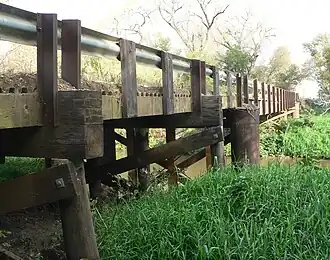 South Dakota Department of Transportation Bridge No. 63-210-282 was located about 1 mile (1.6 km) west and 1.1 miles (1.8 km) south of Centerville, carrying 461st Avenue over the East Fork Vermillion River just north of 296th Street. It was a three-span structure, with timber-framed approach spans on either side of a central Pratt through truss. The main span was 95 feet (29 m), and rested on steel tubular piers, while the outermost supports were timber crib abutments. The truss elements were riveted together, and the bridge's deck support consisted of two layers of wooden planking set on timber beams laid over steel I-beams, which were riveted to hangar plates on the trusses.[2]