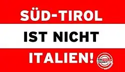 In mid 2007, the party presented a provocative poster campaign with the slogan Süd-Tirol ist nicht Italien! ("South Tyrol is not Italy") and the Austrian flag as background.[5] A sign with the same content was also set up at the Brenner Pass border, in June 2008.[6]
