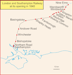 On 14 June 1839, the London and Southampton Railway adopted the new name of the London and South Western Railway (LSWR).[22] Four days earlier, the first trains had run from Winchester to a temporary terminus north of Southampton at Northern Road (now Northam).[23] The extension from Shapley Heath to Basingstoke also opened on 10 June 1839,[24] and the section between Basingstoke and Winchester, which required three tunnels, was finished in May the following year.[25] The opening ceremony for the completed line from Nine Elms to Southampton took place on 11 May 1840, with a directors' train leaving London at 8 am and arriving at the permanent terminus, designed by William Tite, around three hours later.[21][26]