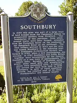 The town of Southbury was one of several towns formed out of parcels of land purchased from the Pootatuck Native Americans. Southbury was originally part of Woodbury, which was settled in 1673. A meetinghouse for the Southbury Ecclesiastical Society was built in 1733, and in 1787 the town of Southbury was incorporated.[2] After two decades within Litchfield County, Southbury was transferred to New Haven County in 1807.[3]