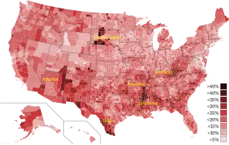The boundaries of the subregion depend on the exact criteria being used. Census data is used to identify rural Southern counties with a large black population in a particular year. Which percentage and which year depends on the goals of the project—to look at history, or at current patterns, or to project future trends. In 1980, Southern counties with at least 25% African American populations comprised 29% of the Southern United States' population, falling to 23% in 2005. The white population in the same counties fell from 23% to 17%. In total numbers, these counties included 6,700,000 blacks in 1980, and 8,400,000 in 2005. They included 10,700,000 whites in 1980 and 11,700,000 in 2005.[4] The book by sociologist Howard W. Odum Southern Regions of the United States (1936) pulled together a wide variety of facts and figures about the Southeast. This book was heavily used by government administrators and regional planners as well as scholars.[5] In 1936, sociologist Arthur Raper described the Black Belt as some 200 plantation counties where blacks represented more than 50% of the population, lying "in a crescent from Virginia to Texas".[6] Black population decreased in some areas after the Second Great Migration, when 4.5 million rural blacks left the region from 1940 to 1970. But the University of Alabama in 2007 classifies "roughly 200 counties" as comprising the Black Belt, with significant black populations.[7] The Mississippi Encyclopedia adds to this definition a long history of cotton production.[1]