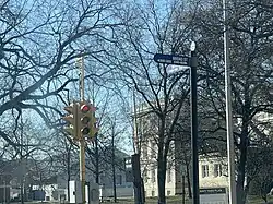 Broad Street runs along a north–south axis between 13th Street and 15th Street, containing what would otherwise be known as 14th Street in the Philadelphia grid plan. It is interrupted by Philadelphia City Hall, which stands where Broad and Market Street would intersect in the center of the city. The streets of Penn Square, Juniper Street, John F. Kennedy Boulevard, and 15th Street form a circle around City Hall at this point.