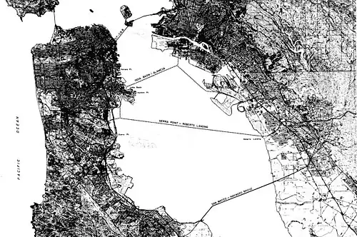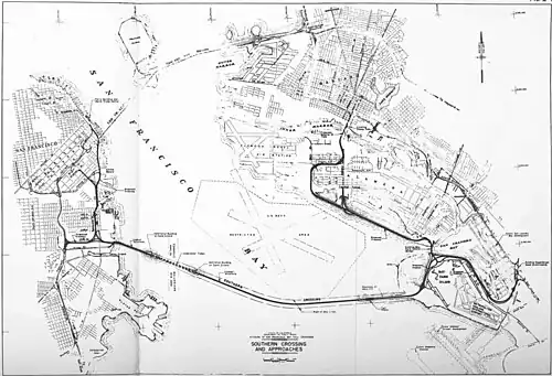 ![]() Map of San Francisco Bay with proposed Southern Crossing (1956 alignment) | |
