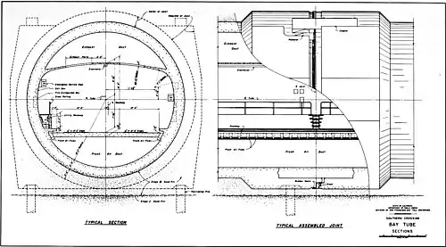 | Bay Tube | | 5,808 ft 1,770 m | Navigation channel is 1,500 ft (460 m) wide allowing a minimum draft of 50 ft (15 m). Tubes set in dredged trench; trench would be 7,700 ft (2,300 m) long, 60 to 70 ft (18 to 21 m) deep, and 140 to 350 ft (43 to 107 m) wide. Cylindrical tube sections each 200.25 ft (61.04 m) long to be fabricated on land, towed into position, sunk into trench, and covered with sand. Tube sections would be 37 ft (11 m) (outer diameter) and 32 ft (9.8 m) (inner diameter), each weighing 5,253 short tons (4,765 t). Fresh air supplied from ventilation structures to duct under roadway; duct above roadway used for exhaust. |