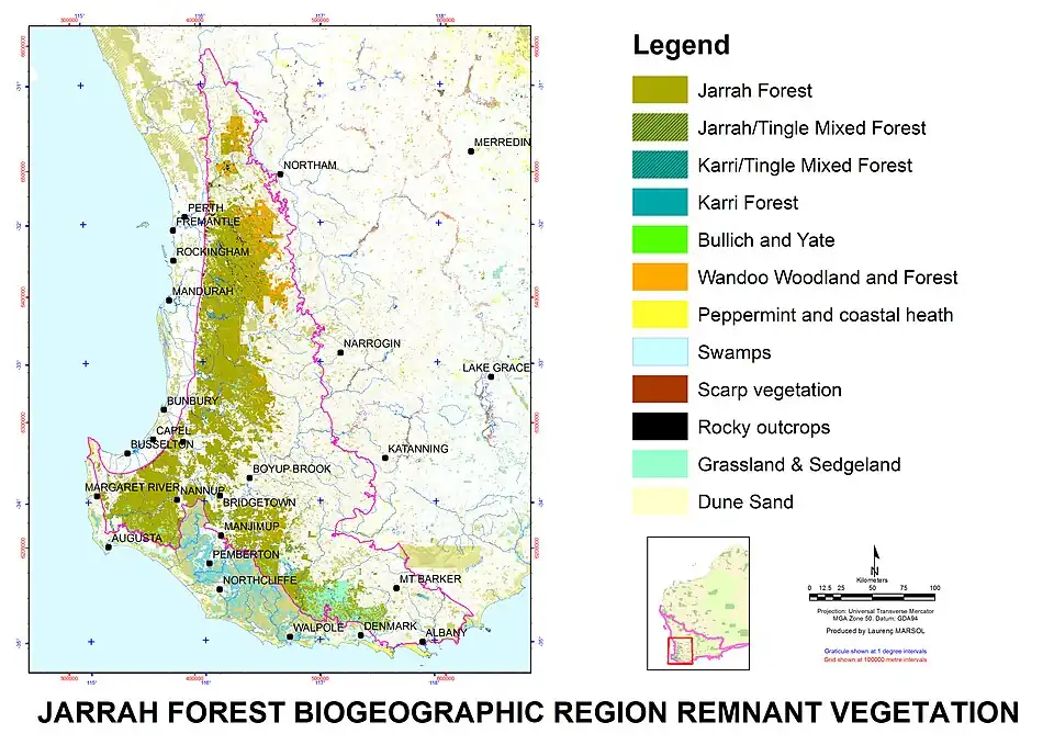 Jarrah Forest, also known as the Southwest Australia woodlands, is an interim Australian bioregion and ecoregion located in the south west of Western Australia.[2][3] The name of the bioregion refers to the region's dominant plant community, jarrah forest – a tall, open forest in which the dominant overstory tree is jarrah (Eucalyptus marginata).[4]
