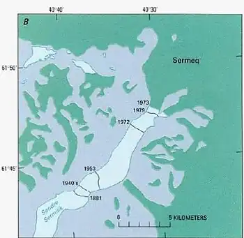 The Sermeq Glacier at the inland end of this fjord has been undergoing a well documented recession in recent history.[3] A similar retreat of the glacier at the fjord's head has been documented in neighbouring Tasermiut Fjord as well.[4]