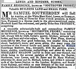 In 1544 William and his younger brother Lawrence moved to Lewes. He lived at Lewes Priory in Southover which he leased from the then owner Anne of Cleves.[7] In about 1550 he married Jane Ernley who was the daughter and heiress of William Ernley, owner of the Manor of Eryles.[8] The couple had one son Nicholas Newton who was born in about 1552. In 1560 William bought a property called “East Mascalls” near Lindfield which he later gave to his son Nicholas.[6] His wife Jane died in about 1560 and several years later William married Alice Pelham[8] and they had one son born in 1564 and two daughters.