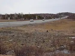 The Southwest Bypasses begin at an interchange with Sudbury Municipal Road 55, with Highway 17 continuing west towards Whitefish beyond the interchange. The four lane divided freeway immediately narrows to a two-lane road as it makes a broad turn from the southeast to the northeast and crosses Junction Creek.[2][3] A 100-metre right of way was designated in the 1970s for expansion of the Southwest Bypass to four lanes at a future date.[4] The route intersects Fielding Road north of the community of Mikkola as it continues curving northeast. It passes Fielding Memorial Park and bird sanctuary before travelling alongside the south shore of Kelly Lake. It makes another broad turn to the southwest, intersecting Southview Drive midway through the curve.[2][3]