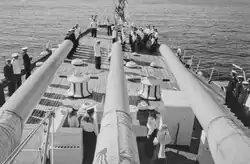 On 22 June 1941 Oktyabrskaya Revolutsiya was in Tallinn when the Germans invaded the Soviet Union, but she was forced to sail for Kronstadt by the advancing Germans. She opened fire on troop positions of the German 18th Army on 8 September from the channel between Leningrad and Kronstadt,[14] and probably landed four 120-millimeter (4.7 in) guns on the following day for use ashore.[13] She was badly damaged on 21 September by three bomb hits on her bow that knocked out two turrets and she was sent to the Ordzhonikidze Yard on 23 October for repairs. The Soviets took advantage of this time to add four more 37-mm 70-K AA guns and another twin 76.2-mm K-81 gun mount between February and April 1942.[15] She was hit again by one heavy and three medium bombs dropped by Heinkel He 111s of KG 4 during the night of 4–5 April.[16] and again by three bombs on 24 April. Her repairs were completed in November 1942, although a quadruple 37-mm 46-K gun mount was added in September. She supported Soviet forces during the Siege of Leningrad, the Leningrad–Novgorod Offensive in January 1944 and the Vyborg–Petrozavodsk Offensive in June 1944. She received a Lend-Lease British Type 279 air-warning radar sometime during 1944. On 22 July 1944 she was awarded the Order of the Red Banner.[15]