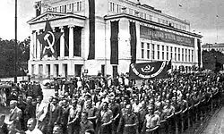 Publicly, on 31 October 1939, the Soviet Supreme Council called fears of Baltic Sovietization "all nonsense".[31] Privately, this stationing of Soviet troops in Latvia under the terms of the mutual assistance pact marked the beginning of the fruition of long-standing Soviet desires to gain control of the Baltics.[32][33]