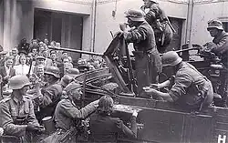 With memories of the mass deportations of a week before still fresh, the German troops were widely greeted at their arrival by the Latvians as liberators. The Latvian national anthem played on the radio, and, as Chris Bellamy wrote: "the [anti-Soviet] rebellion broke out immediately after the news of Barbarossa".[47] The majority of ethnic Latvians who had been forced to serve in the Red Army deserted from their units, and soon afterwards attacked the NKVD. On 2 July 1941, a unit of Latvian deserters captured the town of Sigulda, and three days later, Latvian rebels took control over another town, Smiltene, also blocking the strategic road to Pskov. Latvians did not only desert en masse from regular Red Army units, they also escaped from military training camps, which were part of the Soviet mobilization plan. Among other battles with retreating Soviet units, Bellamy mentions Limbaži (4 July), Olaine (5 July), and Alūksne (9 July). All these locations were captured by Latvian rebels before the first Wehrmacht units appeared in the area.[47]