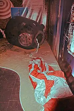 The descent module (Russian: Спуска́емый Аппара́т, romanized: spuskáyemy apparát), also known as a reentry capsule, is used for launch and the journey back to Earth. Half of the descent module is covered by a heat-resistant covering to protect it during reentry; this half faces forward during reentry. It is slowed initially by the atmosphere, then by a braking parachute, followed by the main parachute, which slows the craft for landing. At one meter above the ground, solid-fuel braking engines mounted behind the heat shield are fired to give a soft landing. One of the design requirements for the descent module was for it to have the highest possible volumetric efficiency (internal volume divided by hull area). The best shape for this is a sphere – as the pioneering Vostok spacecraft's descent module used – but such a shape can provide no lift, resulting in a purely ballistic reentry. Ballistic reentries are hard on the occupants due to high deceleration and cannot be steered beyond their initial deorbit burn. Thus it was decided to go with the "headlight" shape that the Soyuz uses – a hemispherical upper area joined by a barely angled (seven degrees) conical section to a classic spherical section heat shield. This shape allows a small amount of lift to be generated due to the unequal weight distribution. The nickname was thought up at a time when nearly every headlight was circular. The small dimensions of the descent module led to it having only two-man crews after the death of the Soyuz 11 crew. The later Soyuz-T spacecraft solved this issue. Internal volume of Soyuz SA is 4 m3 (140 cu ft); 2.5 m3 (88 cu ft) is usable for crew (living space).
