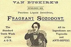 Created in 1859 by druggist Roswell van Buskirk (circa 1824–1902) of New Jersey,[1] it derived its name from the Greek sozo, meaning "to preserve, keep safe", and the stem odont-, meaning "tooth, teeth". Sozodont was later manufactured by the firm Hall & Ruckel of New York, New York, and London, England. Known as Van Buskirk's Fragrant Sozodont, or Van Buskirk's Fragrant and Antiseptic Sozodont, the product was dispensed from a glass bottle through a metal sprinkler and, as illustrated advertisements show, could be applied to the teeth using a toothbrush. The product made strong use of advertising as a marketing tool and by the late nineteenth century was an established household word.