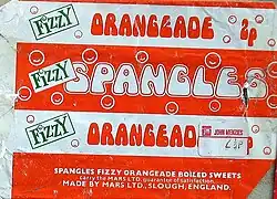 Spangles was a brand of boiled sweets manufactured by Mars Ltd in the United Kingdom from 1950 to the early 1980s.[1] They were sold in a paper packet with individual sweets originally unwrapped but later cellophane wrapped. They were distinguished by their shape which was a rounded square with a circular depression on each face.